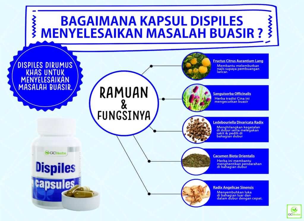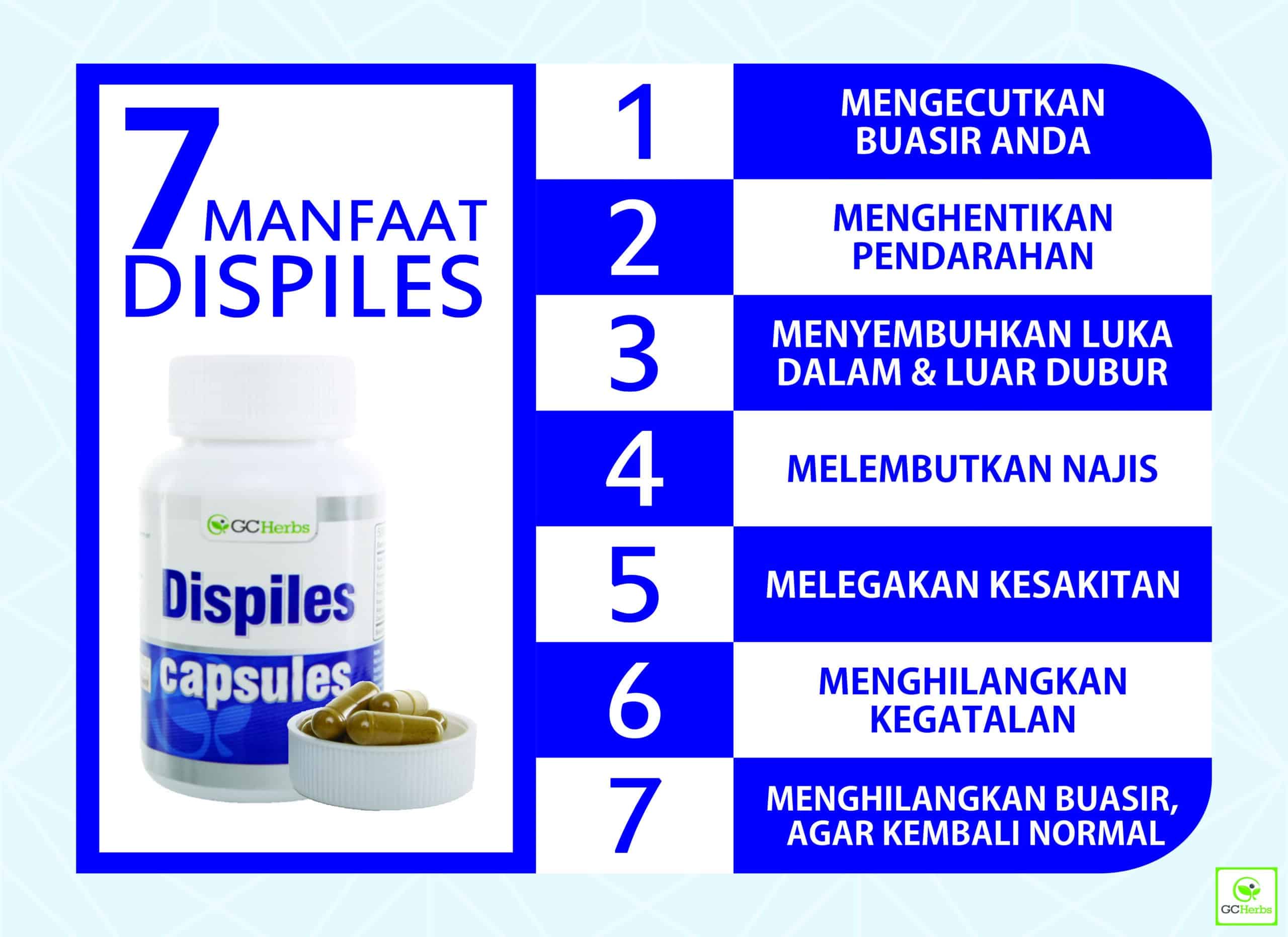 Dispiles mengandungi herba-herba berkualiti yang digunakan secara tradisional untuk merawat buasir. Ia berfungsi mengurangkan bengkak, menghentikan pendarahan, menghilangkan kepedihan dan kegatalan, serta membantu memperbaiki fungsi usus.